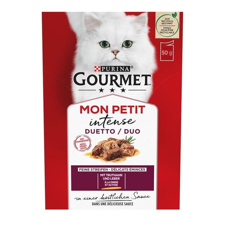 پوچ گربه گورمت طعم بوقلمون و جگر ورقهای Gourmet Mon Petit Turkey & Liver Cuts – وزن ۵۰ گرم