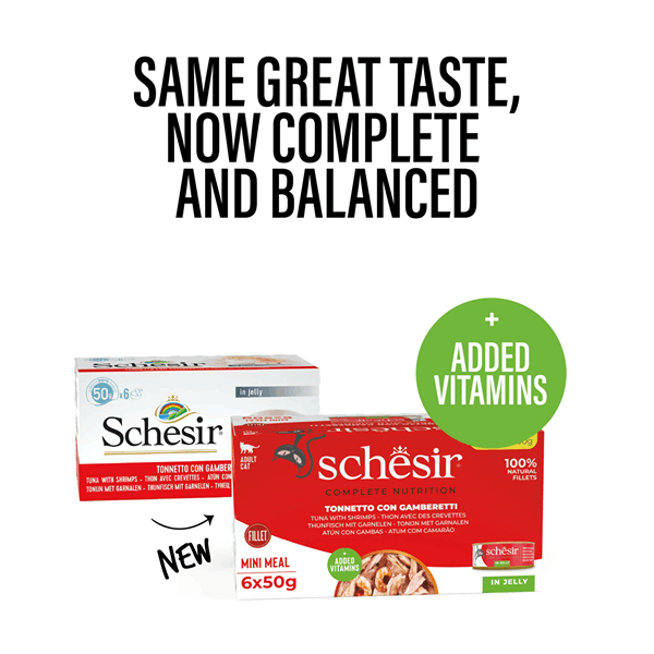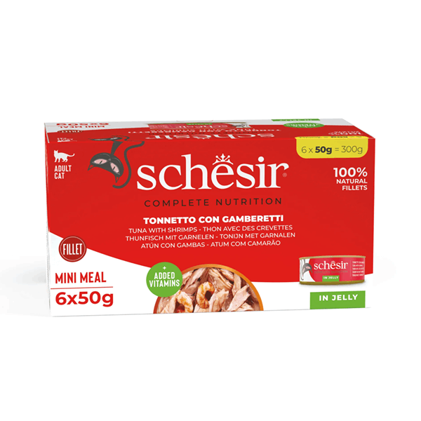 کنسرو گربه شسیر طعم ماهی تن با میگو در ژله Schesir wet cat food tuna & shrimps in jelly وزن 50 گرم بسته 6 عددی