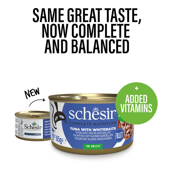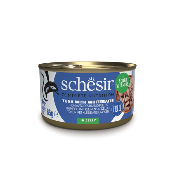 کنسرو گربه شسیر طعم فیله ماهی تن با ماهی سفید ریز در ژله Schesir wet cat food tuna filet with whitebaits in jelly وزن 85 گرم