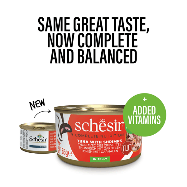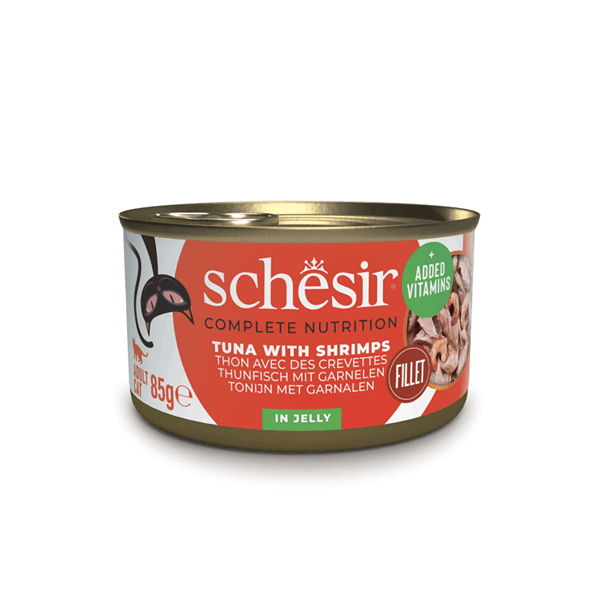 کنسرو گربه شسیر طعم ماهی تن با میگو در ژله Schesir wet cat food tuna fish & shrimp in jelly وزن 85 گرم