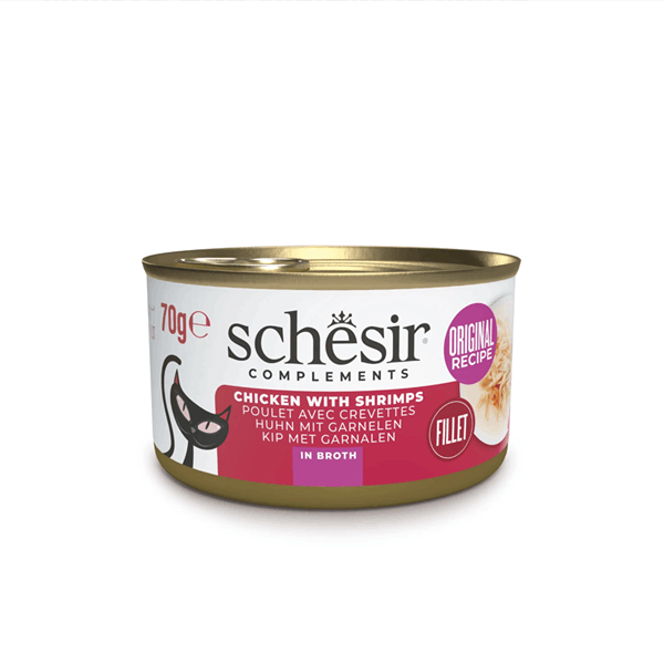 کنسرو گربه شسیر طعم مرغ با میگو در آبگوشت Schesir wet cat food chicken & shrimp in broth وزن 85 گرم