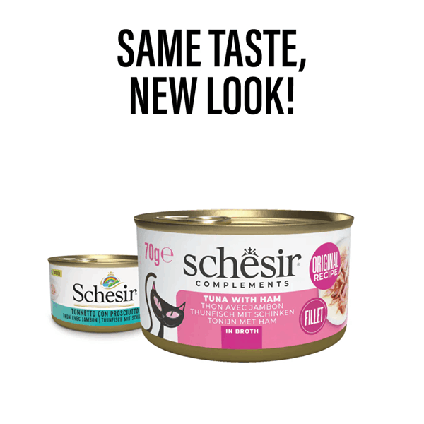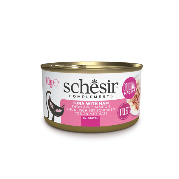 کنسرو گربه شسیر طعم فیله ماهی تن با ژامبون در آبگوشت Schesir wet cat food tuna filet & ham in broth وزن 85 گرم