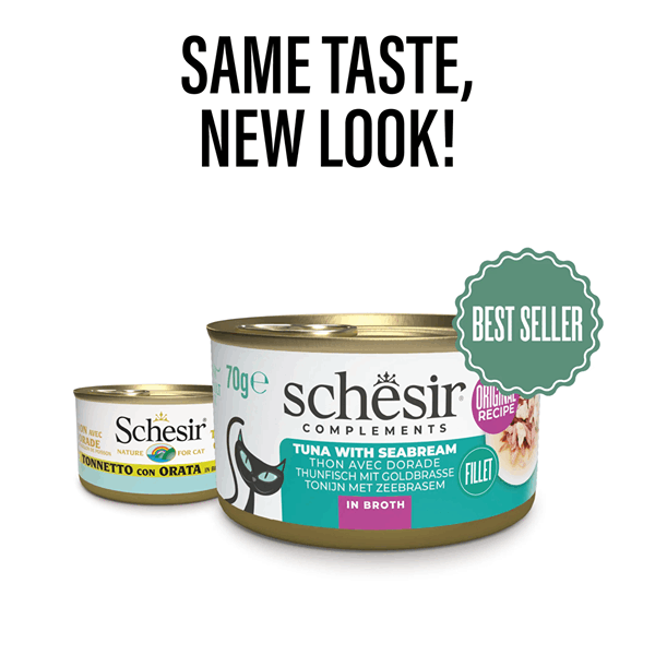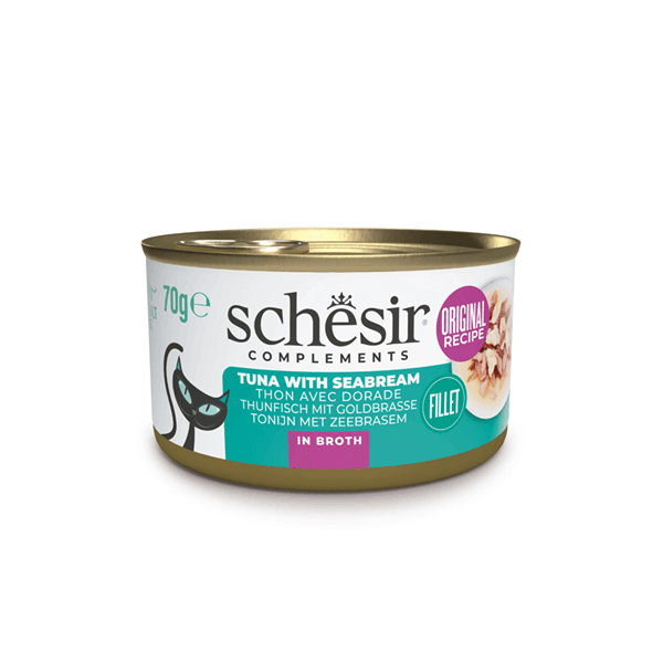 کنسرو گربه شسیر طعم فیله ماهی تن با سیبریم در آبگوشت Schesir wet cat food tuna filet & seabream in broth وزن 85 گرم