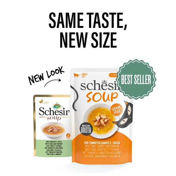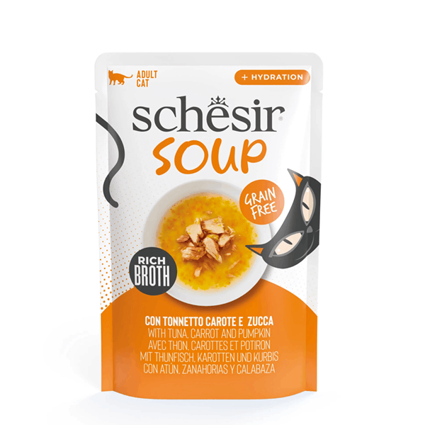 سوپ گربه شسیر طعم ماهی تن، هویج و کدو حلوایی Schesir cat soup tuna, carrot & pumpkin in broth وزن 40 گرم