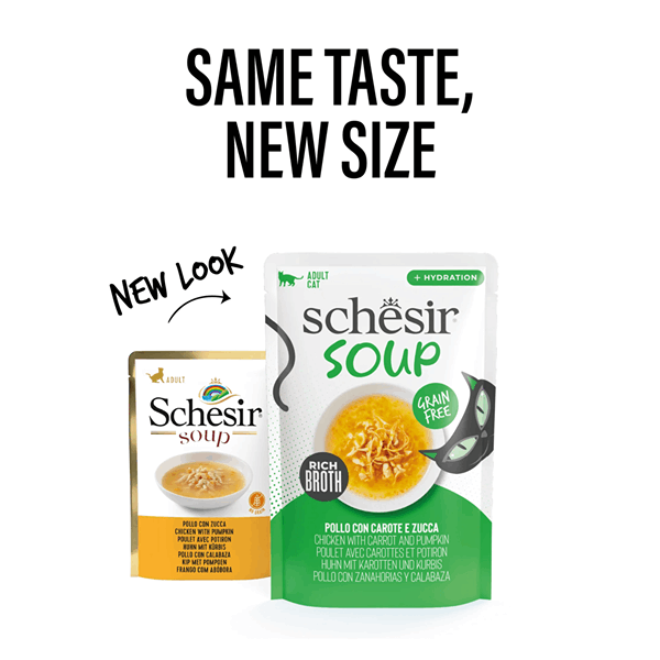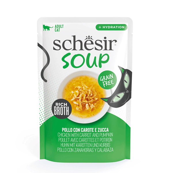 سوپ گربه شسیر طعم مرغ، هویج و کدو حلوایی Schesir cat soup chicken, carrot & pumpkin in broth وزن 40 گرم