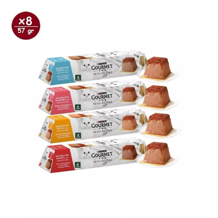 دسر گربه گورمت رولیشنز مدل مولتی پک چهار طعم Gourmet revelations cat multipack Mousse وزن 57 گرم پک 8 عددی